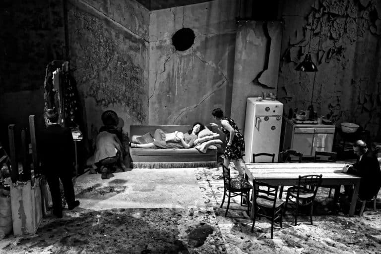 Le plateau est petit mais la magnifique scénographie de Marie Szersnovicz y prend une place conséquente : nous sommes pour un soir dans une maison familiale, aux murs décrépis, un large trou à « jardin » laissant entrevoir un amas d’objets en tout genre issus d’années d’exploitation d’un intérieur domestique transmis de génération en génération.