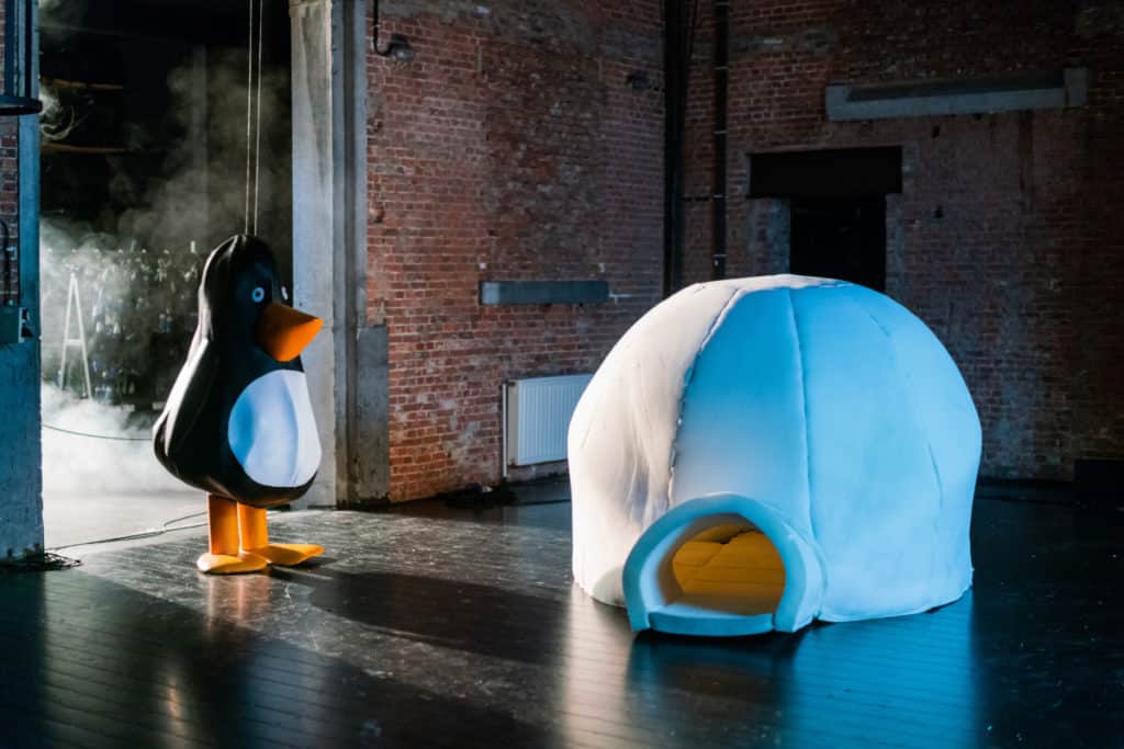 Bienvenue dans un futur proche, sur une banquise de plastique où deux humains, un ours polaire et quatre pingouins se heurtent aux limites du langage et à la tyrannie de la quotidienneté. Première pièce pour grand plateau du jeune metteur en scène bruxellois Silvio Palomo, Origine est un objet scénique singulier, qui distend le temps pour créer une délicieuse étrangeté. Un univers que ne renierait pas Philippe Quesne.