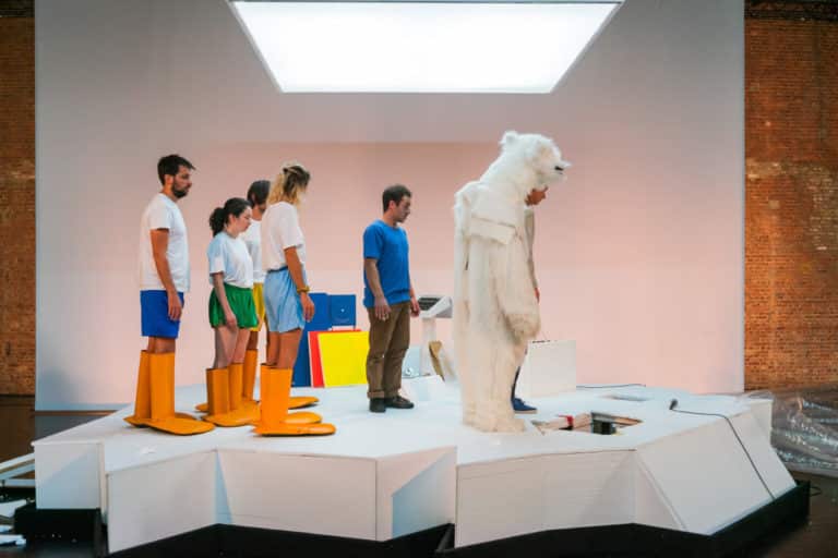Sommes-nous dans un monde postapocalyptique où n’auraient survécu qu’une poignée d’humains et quelques animaux polaires ? Sommes-nous sur une planète désormais envahie par le frimas et les glaces ? Peu importe. S’il y a bien une évocation, en filigrane, d’un monde futuriste dénué de lumière naturelle et de végétation, et si l’on peut certes y voir une inquiétude écologique, nous voilà plutôt dans un espace imaginaire, un monde de survivance duquel émerge une certaine candeur. Sur cette terre redevenue quasi-vierge se dégage un étonnant monde de possibles. Un espace épuré et immaculé, présenté comme un monde excitant, où un homme (Aurélien Dubreuil-Lachaud) et une femme (Manon Joannotéguy) se proposent de s’installer pour dîner. Le temps d’un repas hors de l’ordinaire sur la banquise, ils rencontreront un ours ingénieux (Léonard Cornevin) et des pingouins peu à peu décalottés (Antonin Jenny, Ophélie Honor, Jean-Baptiste Polge et Nicole Stankiewicz), avec qui une communication délicate et étonnamment banale se met en place.