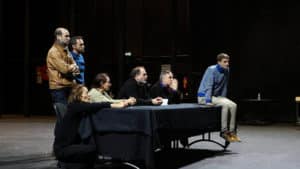 Et ces quatre sessions de répétition ont été espacées de deux-trois mois quasiment chacune. La première session de travail de Cercles a eu lieu au mois d’avril à Bruxelles, la seconde à Toulon au mois d’août, la troisième au mois de décembre et la dernière, qui suivait, au mois de janvier à Paris au Théâtre des Bouffes du Nord, où on a créé le spectacle. Entre chacune de ces périodes, je suis retourné à l’écriture individuelle. Chez moi, ou en tout cas dans des lieux où j’écrivais solitairement. Évidemment, les sessions de travail, de répétition, étaient des moments où je pouvais faire des tentatives, des essais, avec les comédiens. J’ai demandé aux acteurs d’improviser sur des thèmes, des situations, des personnages que je leur proposais. Ça a été l’occasion d’explorer la lumière, le son, l’espace scénographique. Souvent, quand on parle de répétition au théâtre, ils’agit de partir d’un objet défini et le mettre en chantier.