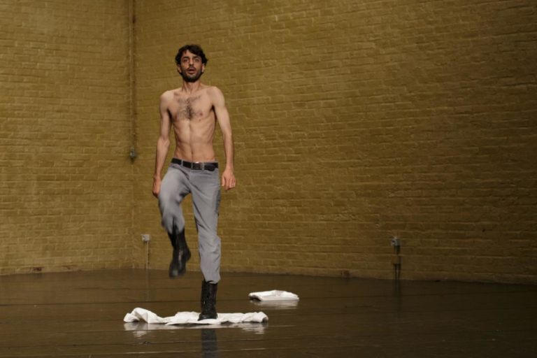 Croiser un Syrien dans la rue à Bruxelles n’entraîne aucune réaction particulière. Nous ignorons la nationalité des personnes qui nous entourent ; la multiculturalité de nos rues est un habitus. A contrario, regarder entrer en scène un danseur syrien dont on connaît la nationalité rappelle instantanément qu’il existe au théâtre plusieurs qualités de silence. Celui qui règne dans la Goudenzaal du Beurschouwburg ce soir est d’une intensité palpable. Chaque geste, chaque pas est scruté avec une attention rare par l’audience faisant corps, comme si chaque geste, chaque pas, était capable de dire enfin, mieux que tout autre canal d’information, le vrai de la guerre et de l’exil. Aucun mot et presque pas de musique ; de la précision, des regards choisis, du tact. Une atmosphère cotonneuse malgré les bottes qui s’autonomisent et les drapeaux blancs qui en disent long. Pas besoin d’agresser la salle pour évoquer le vrai de l’horreur, en somme.