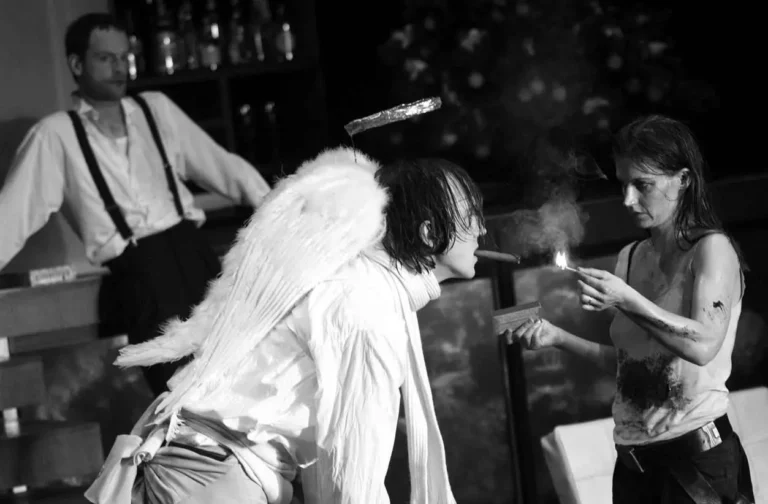 Il s’agissait de défendre le corps con­tre l’abus involon­taire, con­tre l’appropriation, les blessures, la trans­for­ma­tion en marchan­dise. Et il s’agissait de le sen­tir, de se retrou­ver en lui, même en le blessant ou en le détru­isant. Il s’agissait de le quit­ter et de le dépass­er ( gen­der cross­ing – opéra­tion géni­tale – Coca-exs­ta­sy-speed). L’idéal, c’était d’avoir autant de vrais corps que pos­si­ble et ceux-ci devaient être enragés ou som­br­er. Le corps était le dernier bas­tion de l’autonomie et de l’autodétermination. ». Ce sont les paroles d’Ostermeier lors de sa con­férence en 1999 inti­t­ulée Le théâtre à l’ère de son accéléra­tion.