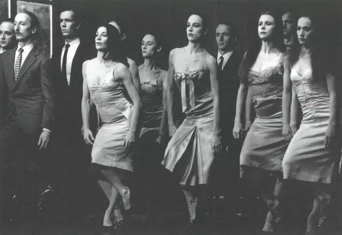Le courant du théâtre vivant du Living Theatre avec THE BRIG (1964) ou PARADISEN NOW (1968) va du mode théâtral au mode chorégraphique inspiré des bacchanales, miroir de la période hippie, du crédo Peace and Love et d’un concept dansé orgiastique. Les corps se mêlent, se délient et réclament le paradis ici et maintenant. Le théâtre anarchiste qui fait éclater toute narration à l’ancienne et privilégie le théâtre des corps et un discours sous-entendu de révolte est le pendant du travail de Pina Bausch. Le Living et Pina Bausch retravaillent les mêmes matériaux humains et mythiques d’après une approche différente. Le Living part des tragédies grecques telles que ANTIGONE et les dissout sur scène dans un mode orgiastique. Quant à Pina Bausch, elle part du modèle d’une danse apprise sous la baguette des maîtres de l’école classique et relie les schémas comportementaux de notre quotidien auprès des mythes anciens (ORPHÉE ET EURYDICE (1975 ), IPHIGÉNIE ( 1973) et des mythes modernes qu’on pourrait qualifier de barthésiens : la boxe (BANDONEON); la mafia (WIESENLAND); le hammam (NEFÉS, 2003). Elle nous aide à percevoir ce qui appartient à des schémas éternels, répétitifs et inéluctables. Le rappel du mythe, de la légende ou des comptines de l’enfance sert d’iceberg de signification. Elle crée ainsi des repères atemporels au détour des jeux d’amour et de destruction.