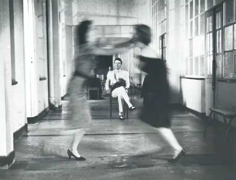Les dif­férents élé­ments du spec­ta­cle sont arrivés à un rythme iné­gal : la scène des enfants qui se pour­suiv­ent dans le couloir, est née du lieu théâ­tral lui-même. On était à un mois à peine de la pre­mière quand Michel Boer­mans nous a emmenés dans ce couloir de pen­sion­nat aban­don­né. Le pre­mier soir, j’ai demandé aux acteurs de me pro­pos­er des frag­ments de sit­u­a­tion, sans me racon­ter d’his­toire, juste des images furtives de l’en­fance. Ils ont impro­visé pen­dant trois heures, il y a eu une cen­taine de propo­si­tions, les gens étaient fous, le lieu fonc­tion­nait à mer­veille. Et moi, pen­dant deux jours, j’ai écrit en essayant de don­ner une struc­ture, une évo­lu­tion. J’ai rajouté des choses aux­quelles je tenais beau­coup depuis le début du tra­vail … L’ange de la pre­mière scène par exem­ple. C’est peut-être ma pre­mière image du spec­ta­cle.